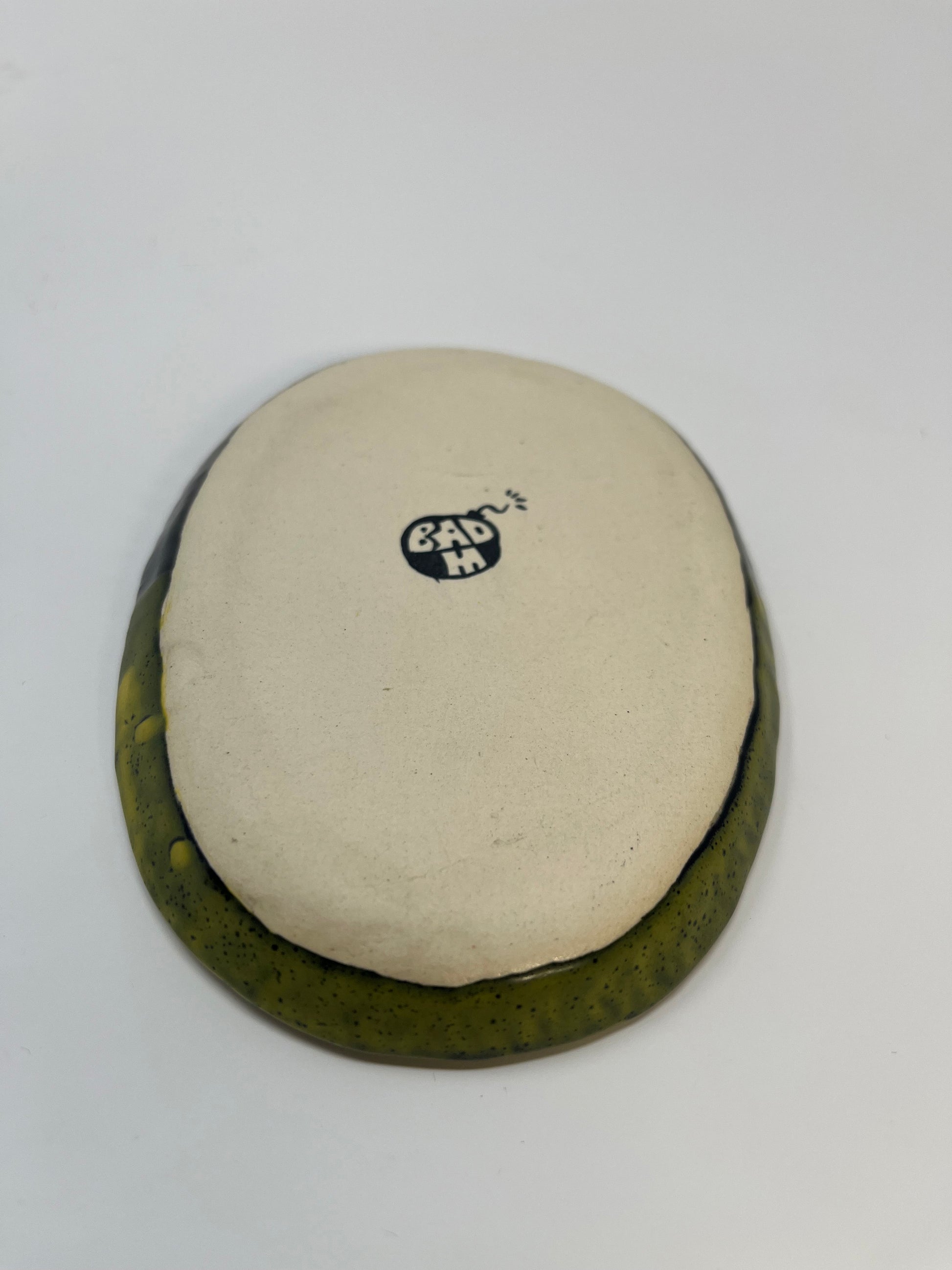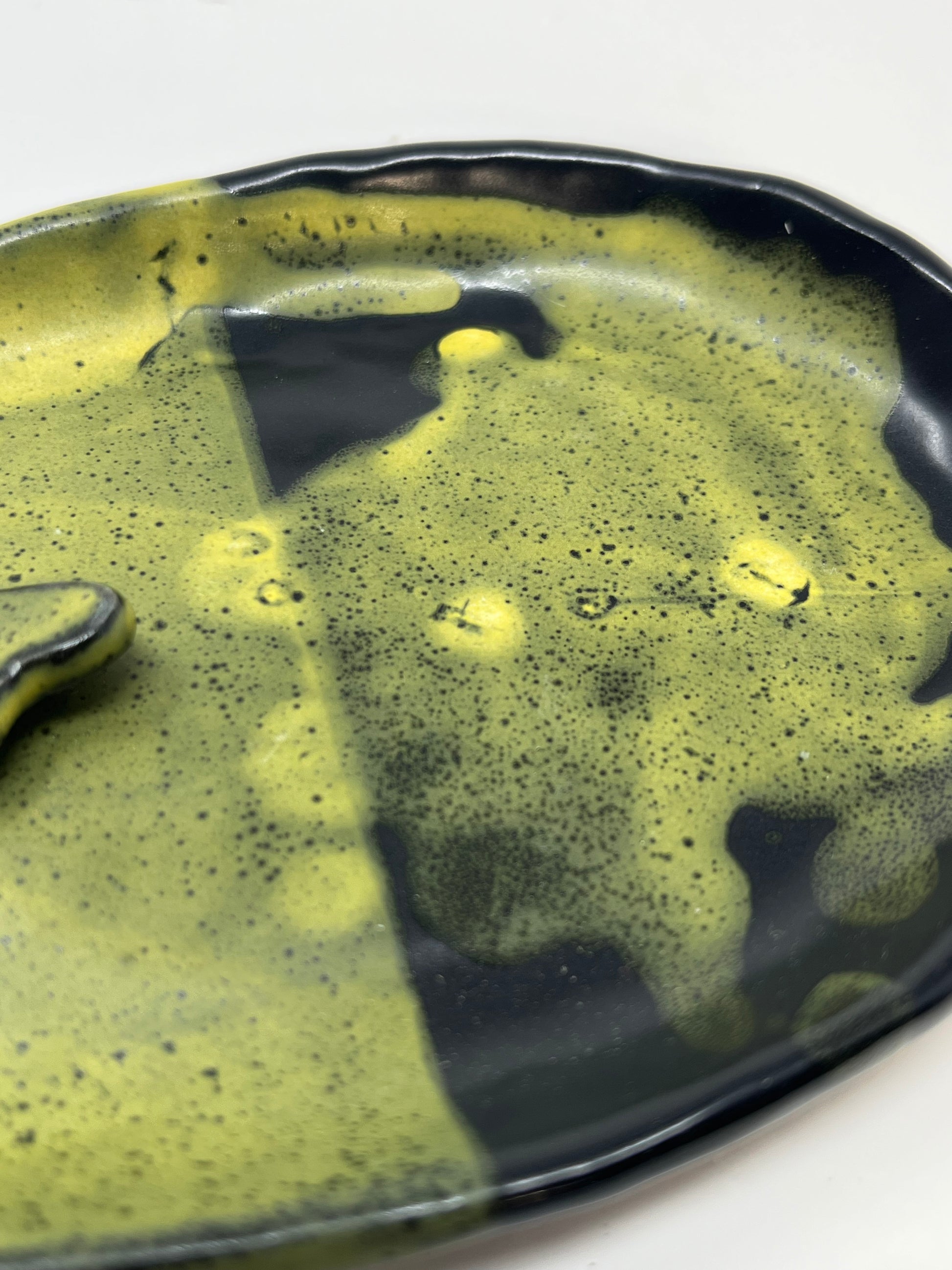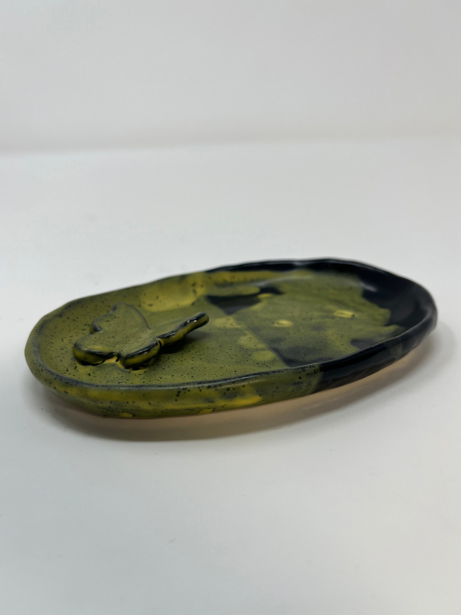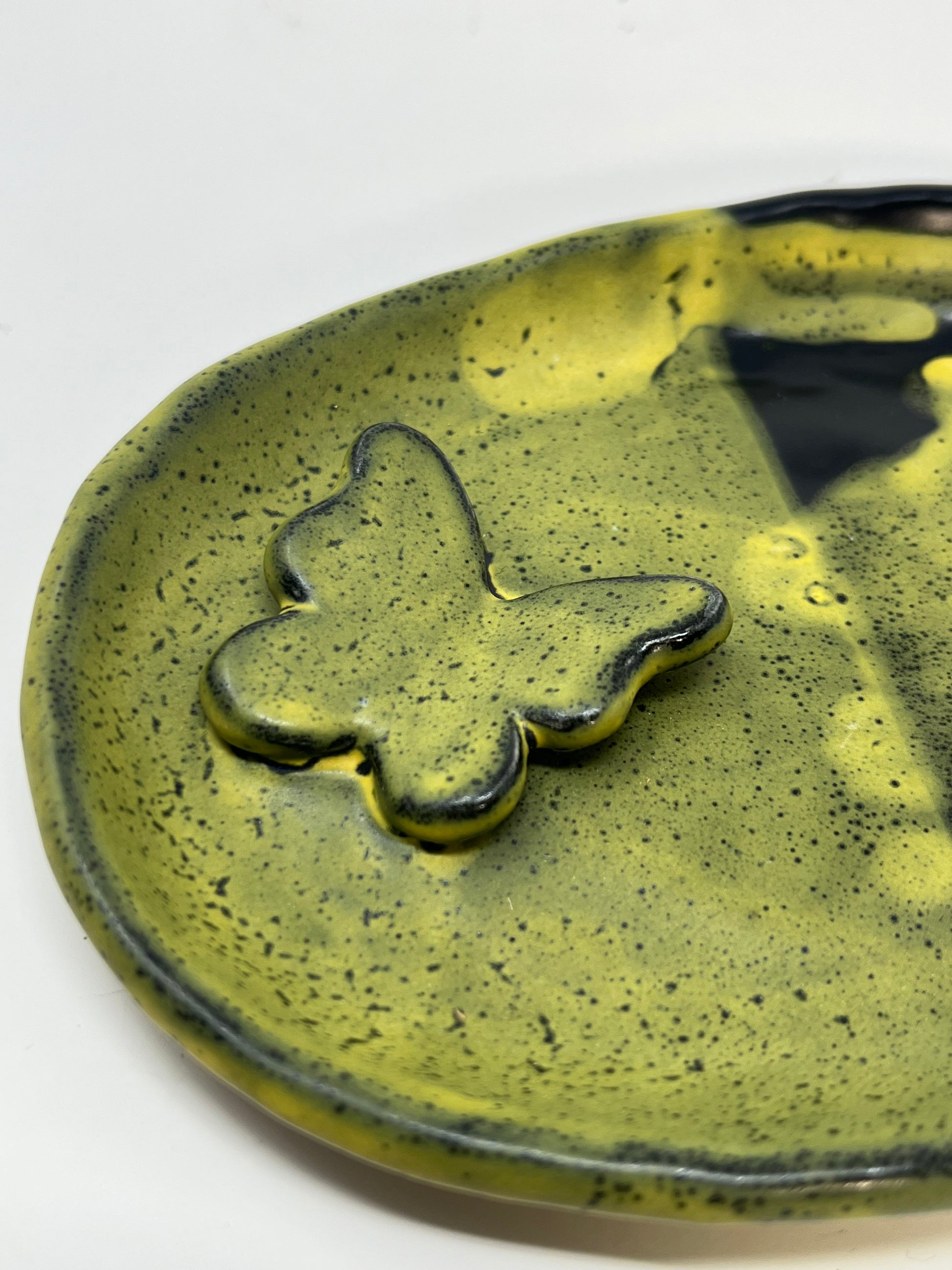Hand built ceramic dish with 3D butterfly charm and hand painted glaze design. Food safe.