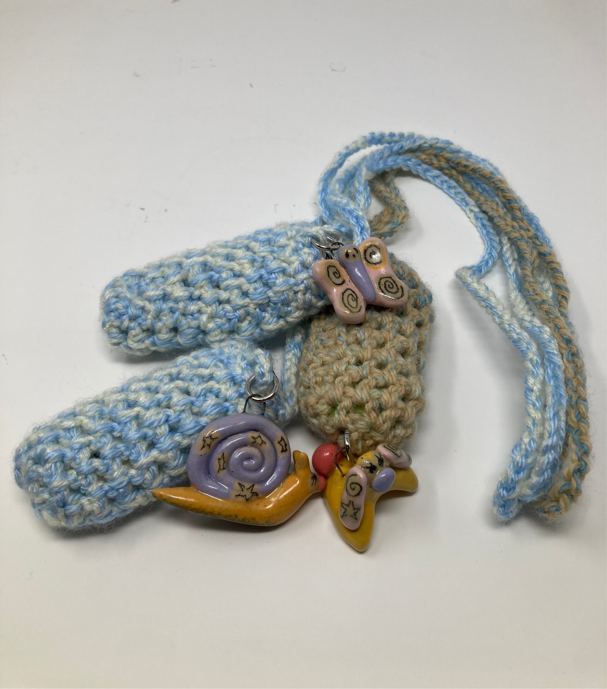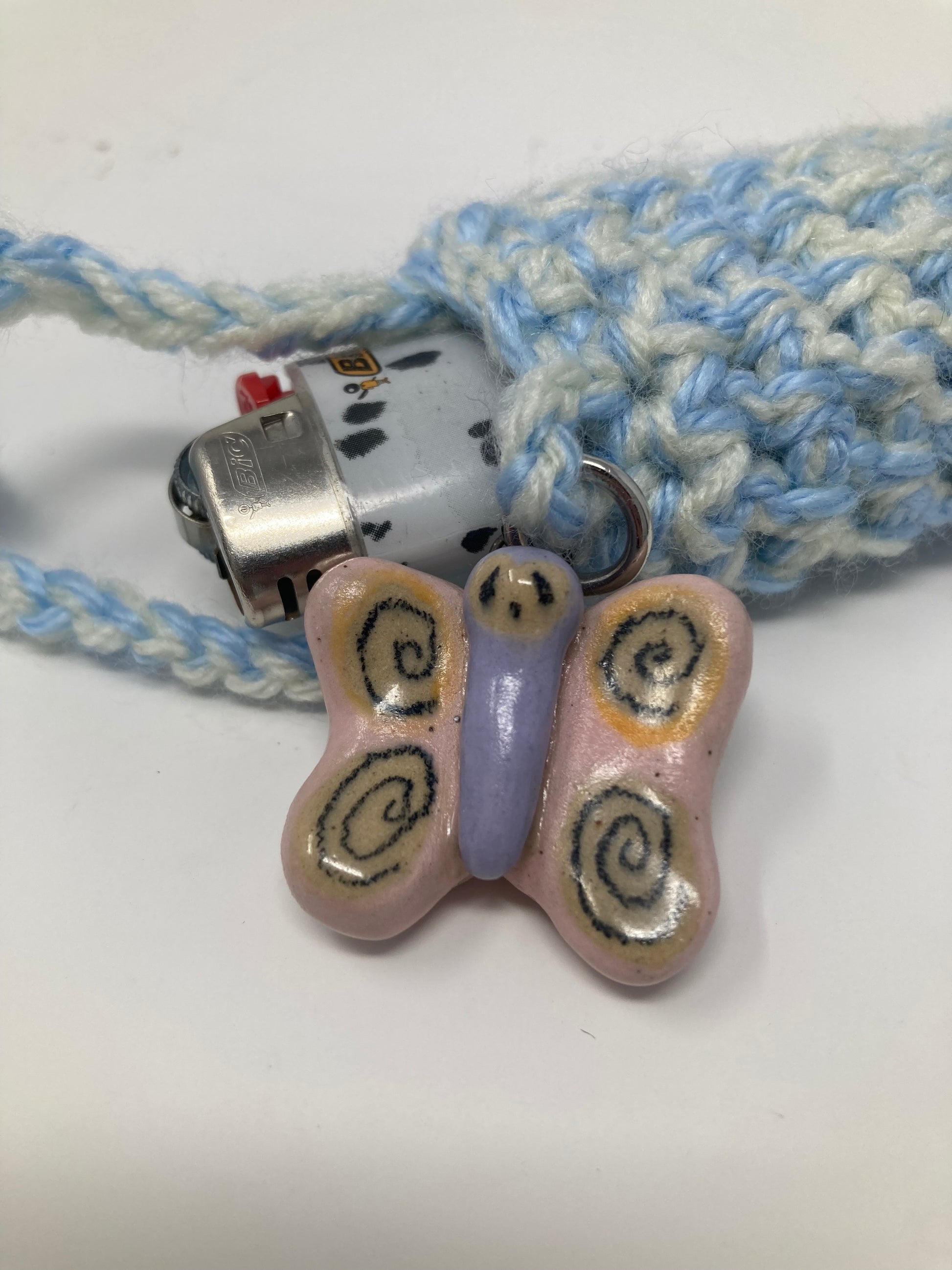 Handmade acrylic yarn crochet lighter holder necklace with hand built ceramic charms. Hand painted with a glaze design. Fits a standard size Bic lighter or smaller.