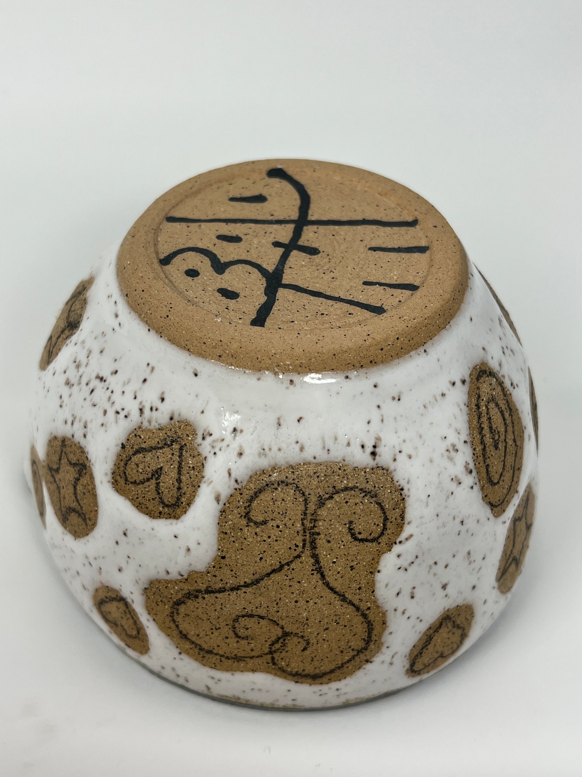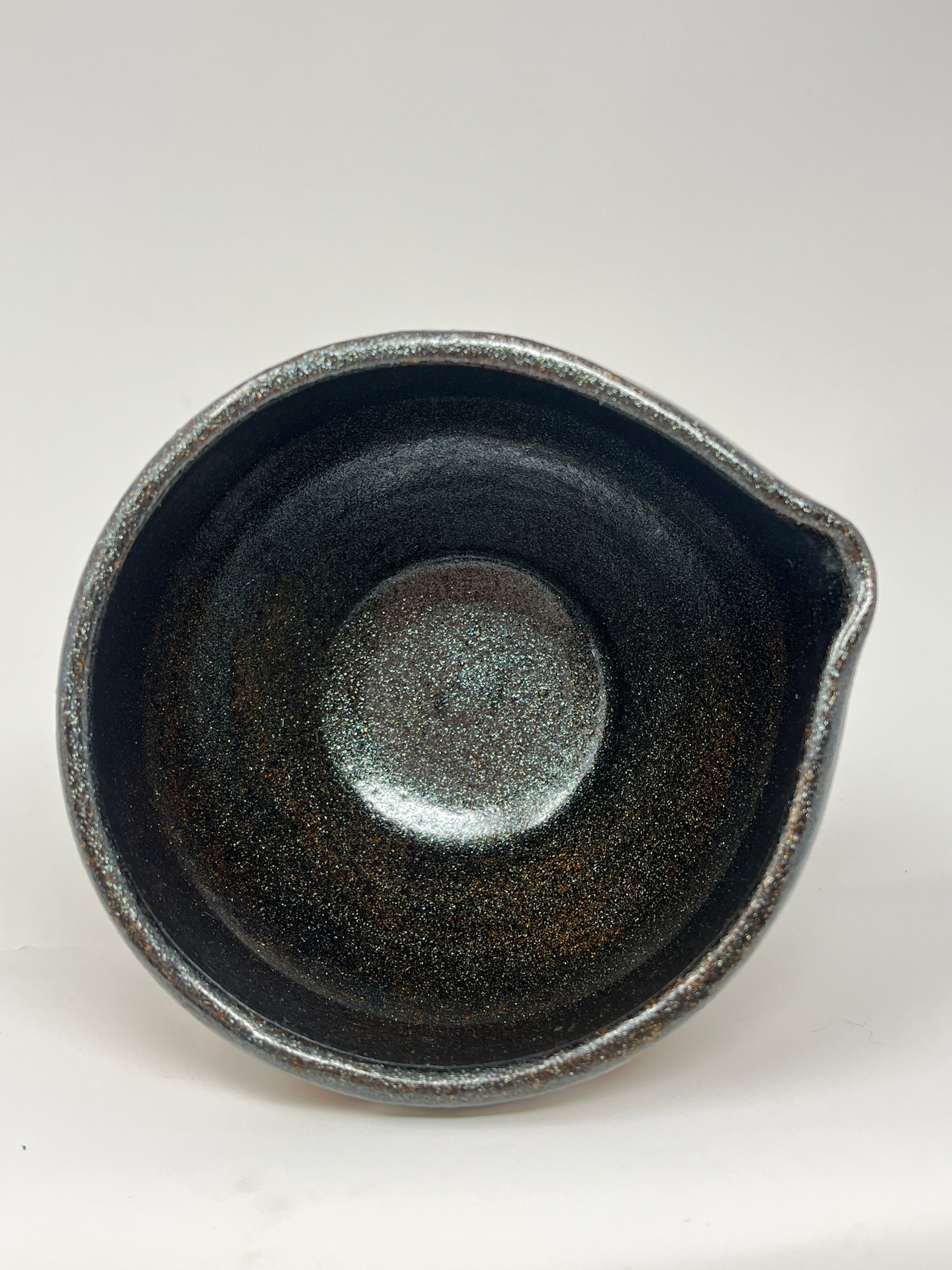 Wheel thrown ceramic tea bowl with spout and hand painted glaze design. Food safe.