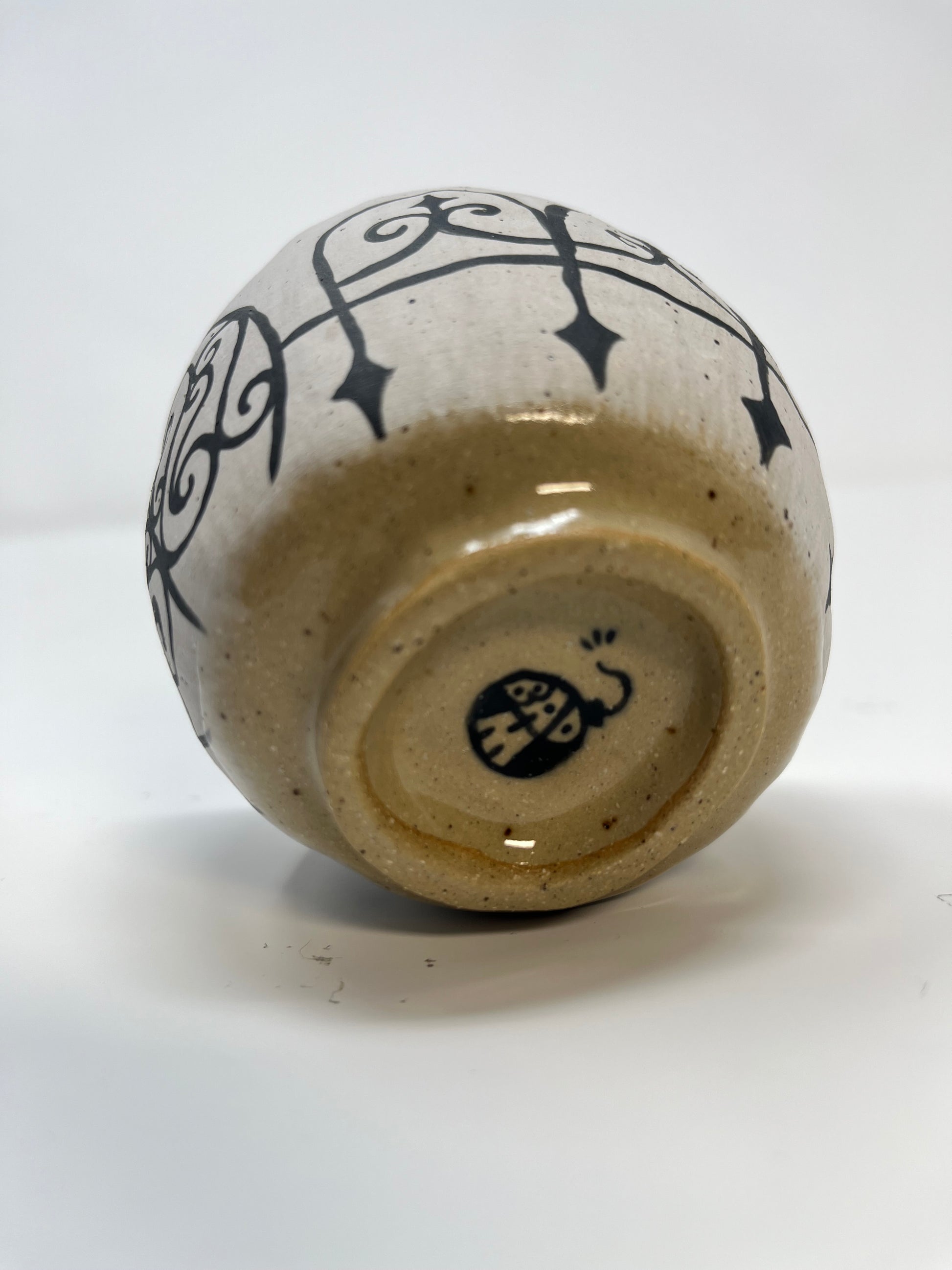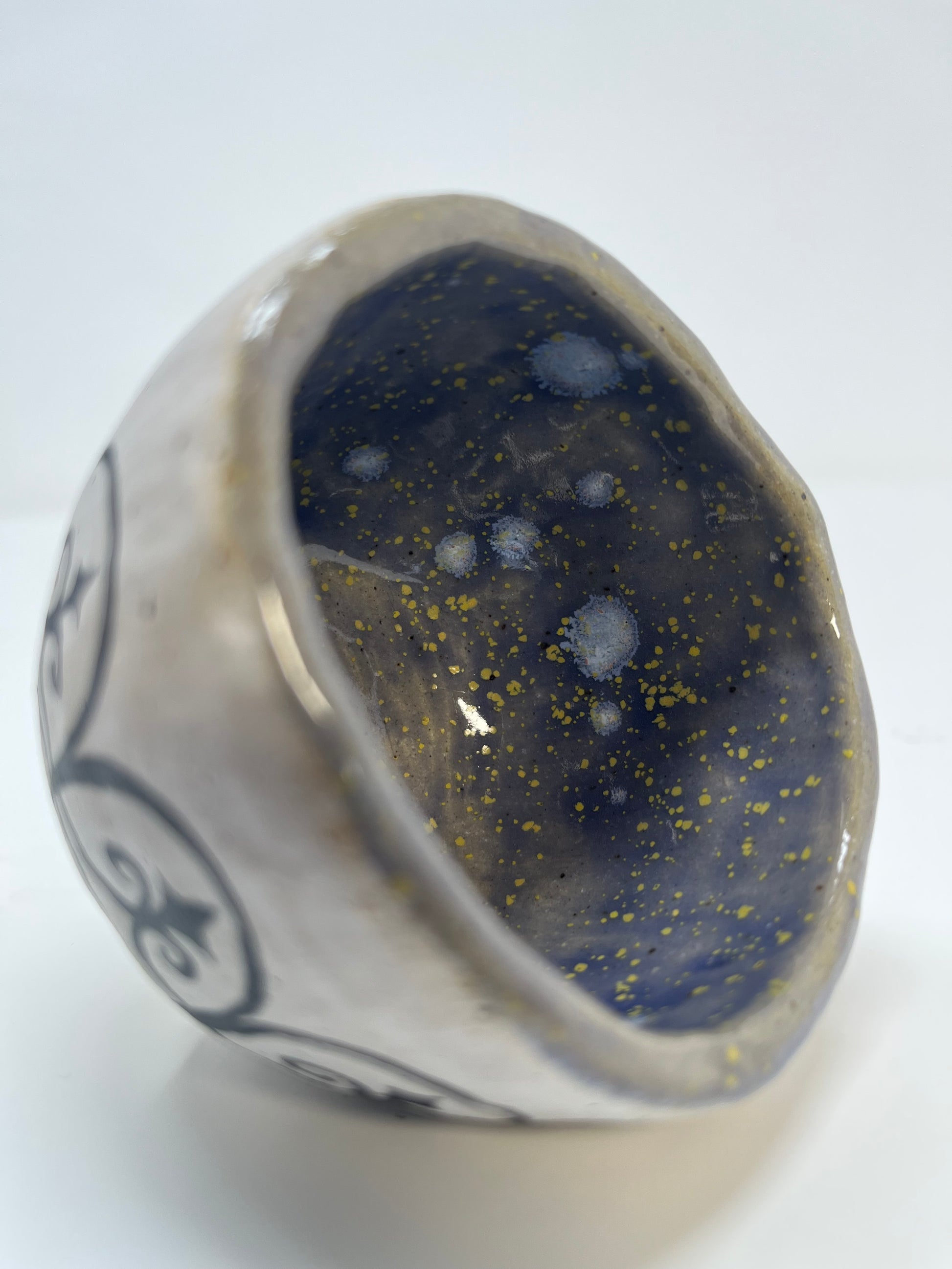 Hand built ceramic tea cup with hand painted glaze design. Food safe.